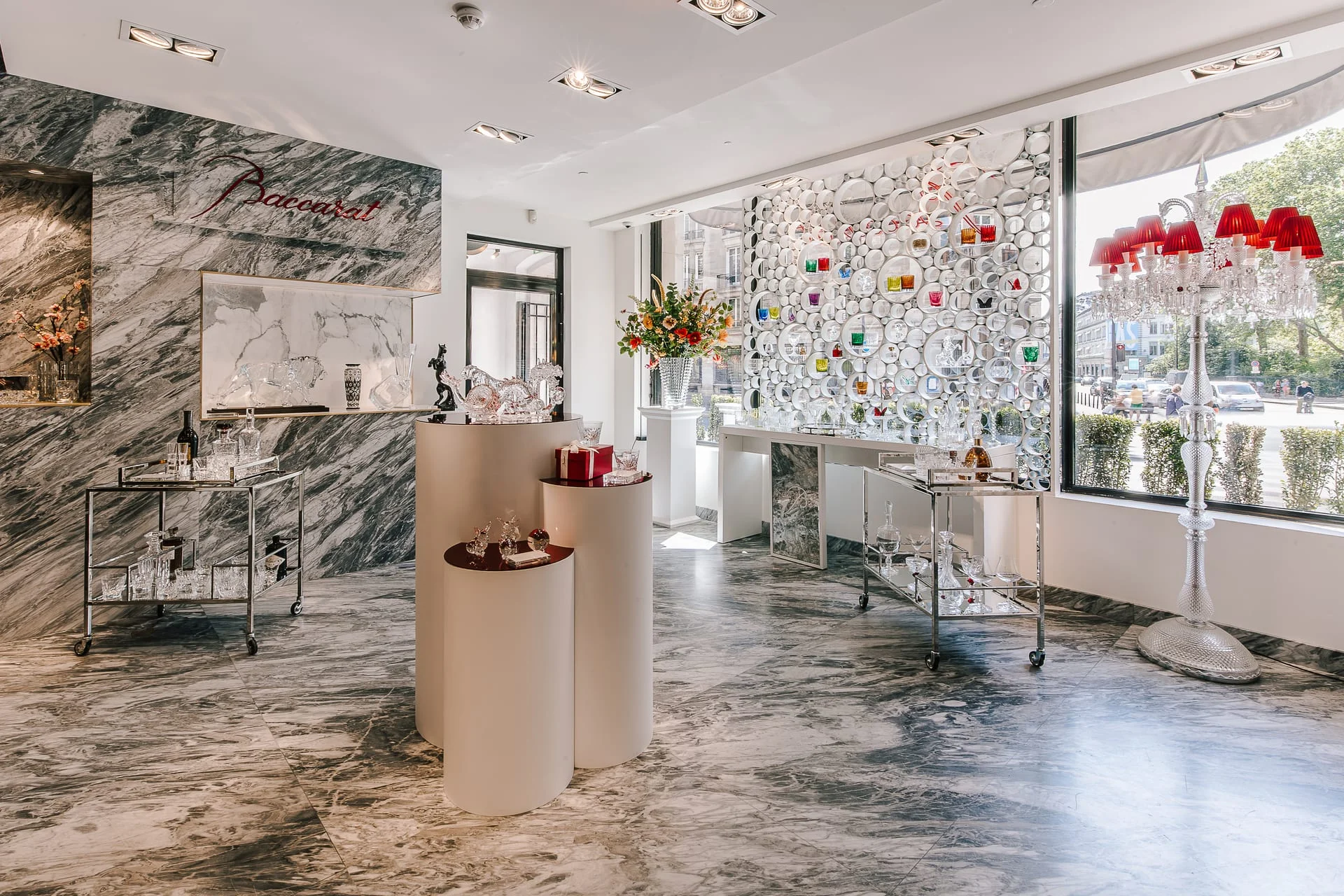 Vitrines et displays éphémères installés à l’hôtel Lutetia. La sculpture tubulaire fait référence aux bulles de champagne ainsi qu’aux anneaux olympiques à l’occasion de JO de Paris 2024